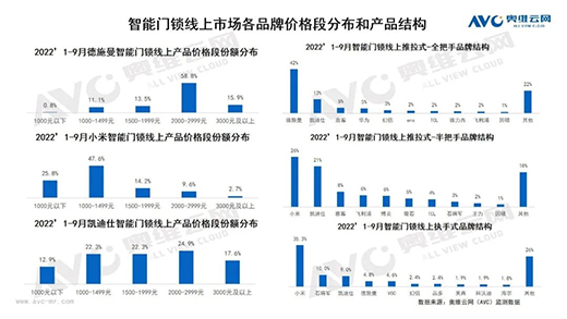 據(jù)奧維云網(wǎng)(AVC)零售監(jiān)測數(shù)據(jù),2022年1-9月,智能門鎖線上渠道零售量361萬臺,同比增長20%;零售額46億元,同比增長3%。線上零售額份額TOP5品牌依次為德施曼、小米、凱迪仕、鹿客、石將軍,市場集中度高達(dá)60%,同比略降3%。