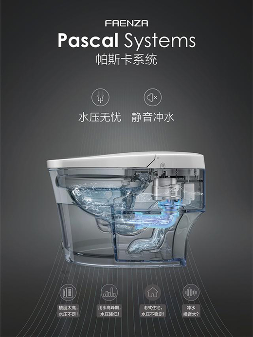產品搭載FAENZA法恩莎創新研發的帕斯卡智能沖水系統,突破高樓層與老舊城區水壓限制,無懼低水壓,同時實現靜音沖水。此外,還集成多項創新潔凈科技:凈瀾釉技術、智能潤壁功能、噴槍自潔功能、UV紫外線殺菌技術、銀離子抗菌座圈、水氣混合清洗技術等,如此完美的外觀+功能,讓其成為名副其實的年度爆款單品。