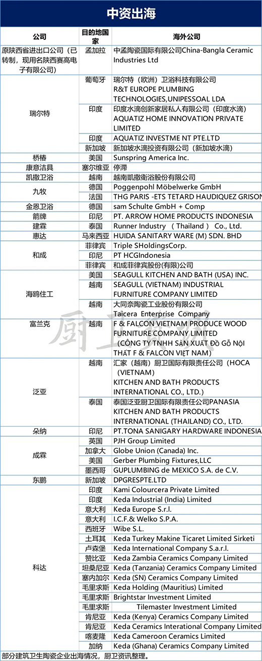 據廚衛資訊不完全統計顯示,目前中國衛浴行業已經有建霖、海鷗、泛亞、富蘭克、科達等十多家企業通過建廠或并購等形式,在海外設立制造基地。在國內產能過剩、市場低迷的背景下,中國品牌走出去,無非也是一種選擇。