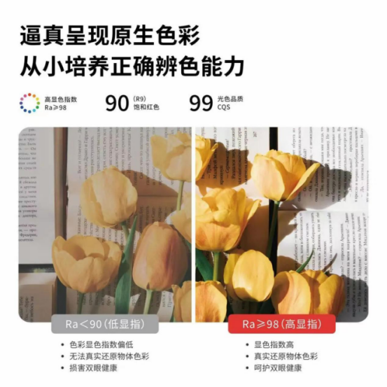高顯色指數Ra≥98,4000k色溫,超高光色品質,重組健康光譜,真實還原自然色彩,幫助孩子塑造正確的色彩表現力和辨別力,眼睛更舒適、不易產生疲勞感,預防近視、色弱等眼部疾病的發生。