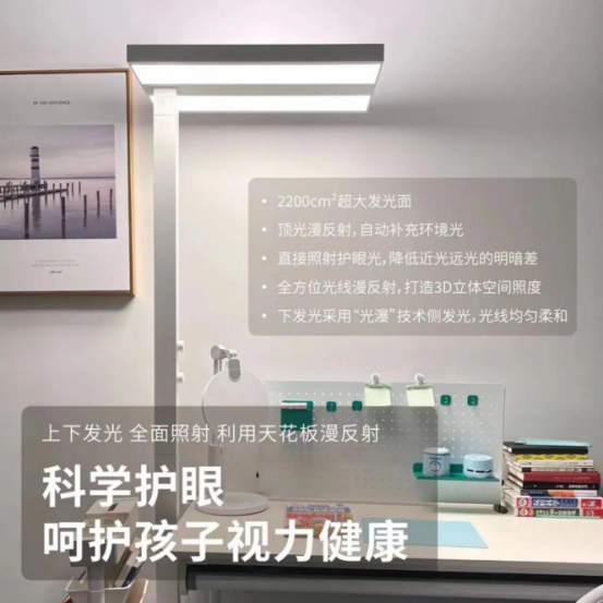 130w大功率、14000lm光通量、2200cm2超大上下發光面板設計,光源面積大,全面照射,能有效補足房間的環境光,避免孩子長期在不同光差下形成的視覺疲勞、視力不健康等問題。