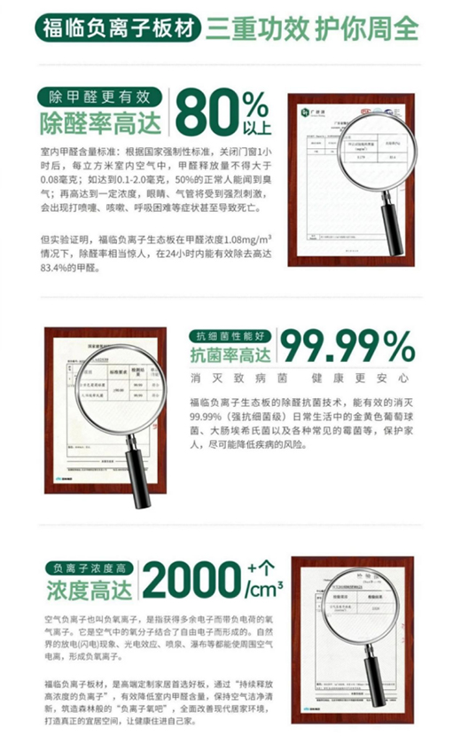 2021年,經過長期研發和嚴密的檢測,福臨板材全新推出的福臨負離子生態板。該板材不僅有高效的除醛抗菌能力,能在24小時內高效除醛高達80%、消滅99.99%的金黃色葡萄球菌和大腸埃希氏菌等生活中的常見菌類,還具有免油漆、不褪色、不變色、無毒無味、耐磨耐劃、防潮性能好、耐高溫等綜合優勢,為美好人居生活賦能,讓健康與幸福走進更多的家庭。