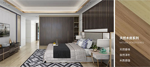 這款板材的飾面采用厚度達到0.5mm以上的珍貴天然木皮、染色木皮或科技木皮,立體感更強,紋理更清晰,裝飾效果更佳。而且采用厚皮無縫拼接技術,相較傳統薄皮手工貼面,具有無重疊、無離縫等特點,給您帶來完美體驗。