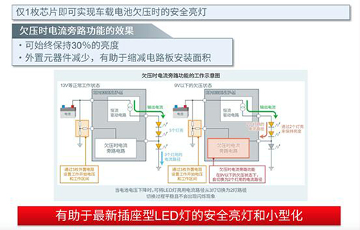 葛家明進一步解釋了該芯片的工作原理:其與外圍3枚電阻去配置來監測電池電壓,當車載電池電壓向下跌落,比如說進入9V以下這個欠壓狀態時,芯片可以去旁路負載中最下面一顆LED,保證剩余的2顆LED燈達到期望的亮度。并且,從3顆燈點亮到欠壓狀態下2顆燈點亮,切換會是平滑平穩的一個過程,不會出現閃爍。