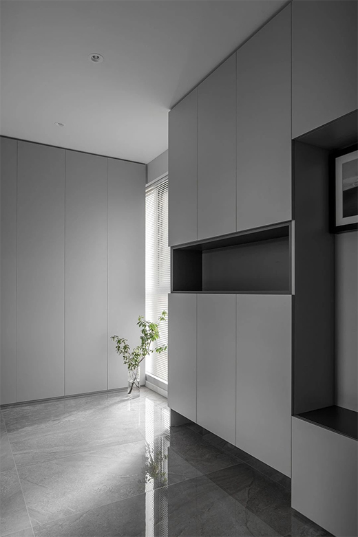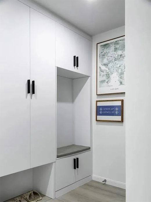 現(xiàn)在流行在一整面墻上把鞋柜和衣柜都做在一起,出入的外套和帽子都可以直接掛在上面,不用設(shè)置轉(zhuǎn)軸門,坐在換鞋凳上換完鞋,起身就能拿取,特別方便。