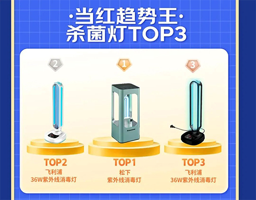 “當紅趨勢王·殺菌燈TOP 3”分別為:兩款飛利浦36W紫外線消毒燈以及松下紫外線消毒燈;