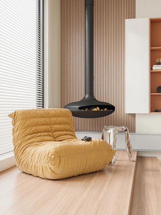 第二個壁爐安裝在窗戶旁邊的天花板上,創(chuàng)造了一個舒適的閱讀角落。一張柔軟的黃色椅子是一個舒適的著陸點,而一個鍍鉻的邊桌則可以用來放置本周的書籍。獨特的木質(zhì)邊桌營造出藝術(shù)、雕塑元素。