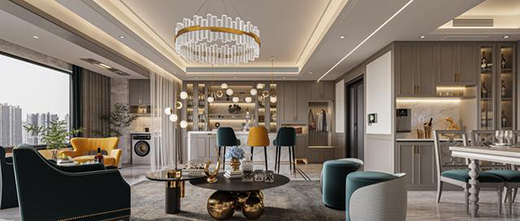 客廳高級時尚的配色給予空間活潑輕奢的格調。設計師將嚴謹的設計理念,和對美學的思考融入其中。盡可能提高儲物收納功能,增加空間利用率。