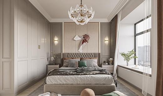 臥室采用高級灰和米白相結合,配色優雅高貴,加上藝術造型金屬吊燈,透露出低調的奢華感。墻面采用了美式常用的護墻板,線條簡單,把控的剛剛好。