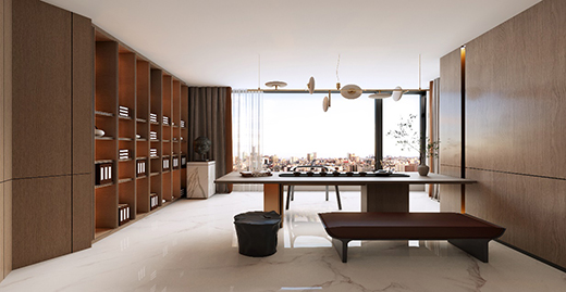 越極簡,越高級,茶室設計給家居增添多一個會客場所。頭頂異型吊燈,給古樸雅韻的茶室空間添了一分現代時尚藝術之感。