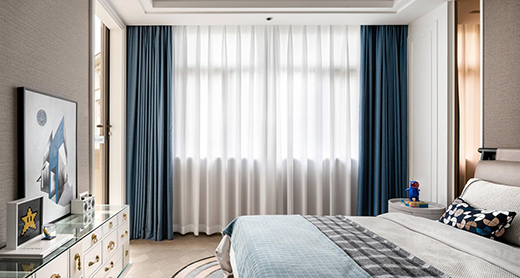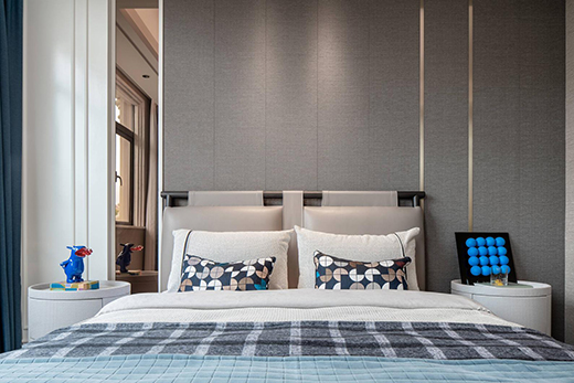 主臥設(shè)計(jì)呈現(xiàn)出低調(diào)內(nèi)斂的氣質(zhì),色調(diào)上的樸質(zhì)自然與軟裝的質(zhì)感緊密貼合,營(yíng)造出細(xì)膩的安靜氛圍。