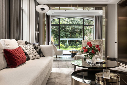 負(fù)一層會(huì)客廳整體通透大氣,品質(zhì)感的家具擺設(shè)與硬裝搭配得天衣無(wú)縫,設(shè)計(jì)師希望借由簡(jiǎn)約而不簡(jiǎn)單的組合,讓優(yōu)雅格調(diào)和氣質(zhì)美感彰顯于空間各處細(xì)節(jié)。方正的空間中,圓弧形巧妙置入,讓品味空間多了一絲柔軟,一抹鮮紅則綻放著生活的熱情,于不經(jīng)意間流溢出不凡品味。
