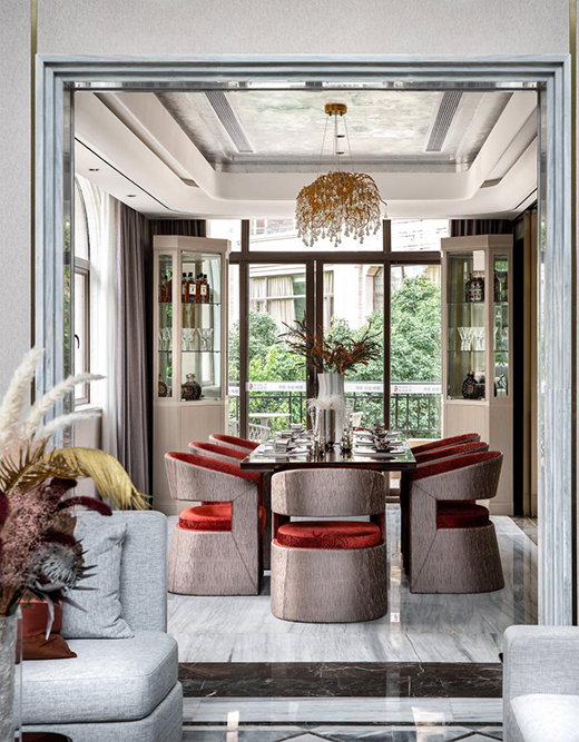 折衷美學(xué)講求比例均衡,注重形式美,設(shè)計(jì)師將這種特質(zhì)在餐廳空間中加以重點(diǎn)呈現(xiàn)。整體空間蘊(yùn)含著一種閑適的自信,沉淀著優(yōu)雅的韻致,墻面板與裝飾畫的搭配保留了一絲古典的豐神情韻,紅色靠椅搭配流光溢彩的餐桌和西式餐具,演繹日常生活的豐瞻之美。