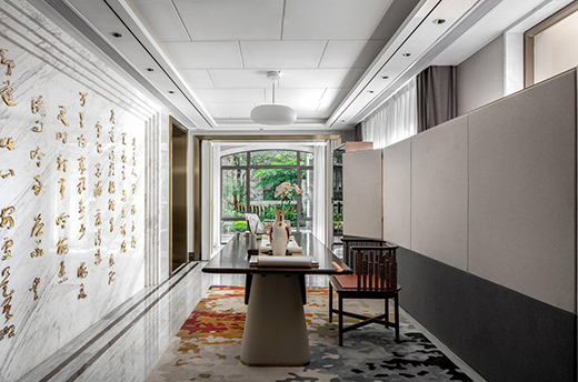 明亮的自然光照、古雅別致的圈椅、富有表現(xiàn)力的墻面鏤刻書法字,設(shè)計(jì)師在書法室這一隅空間中展現(xiàn)了許多不同尋常的室內(nèi)細(xì)節(jié),讓每個(gè)元素和諧地兼容在一起。