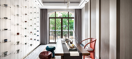 怡然自得的空間氛圍中,散逸著濃郁的人文氣息。設(shè)計(jì)師將幾十枚形制不一的杯盞陳列于一整面背景墻,精美的茶盞由此突顯出獨(dú)到的藝術(shù)韻味,無(wú)用之美,在靜寂中流淌。