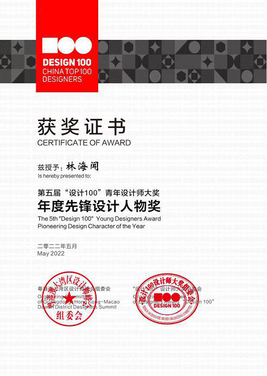 在“設計之都”這個舞臺上,著名設計師、深圳市禾田設計工程有限公司(禾田營造)創始人林海聞憑借多年設計經驗及高水平領導能力,榮獲““設計100·年度先鋒人物”稱號。